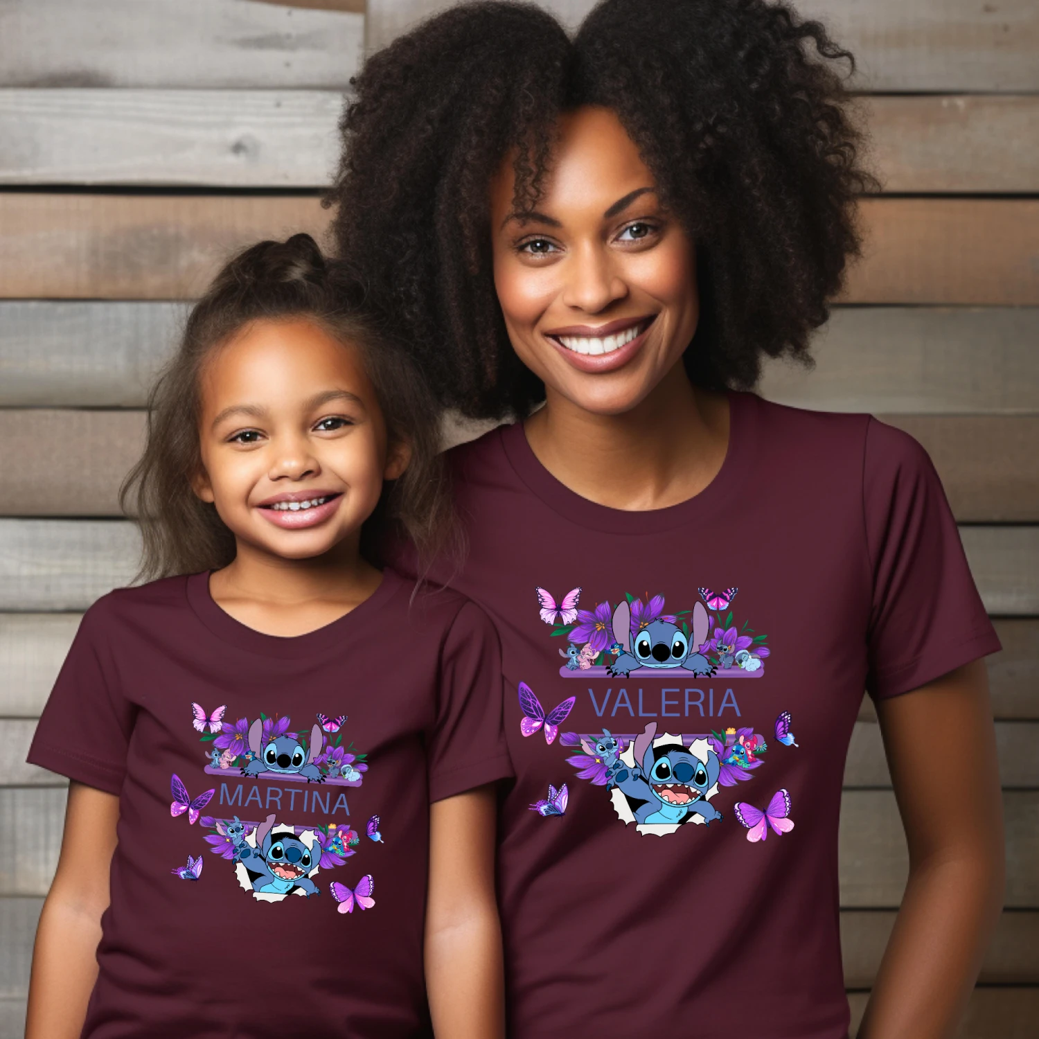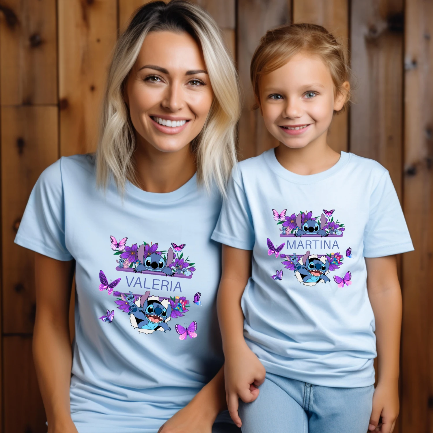Camiseta igual para toda la familia con nuestro amigo Stitch rodeado de mariposas multicolor alegrándonos el día….