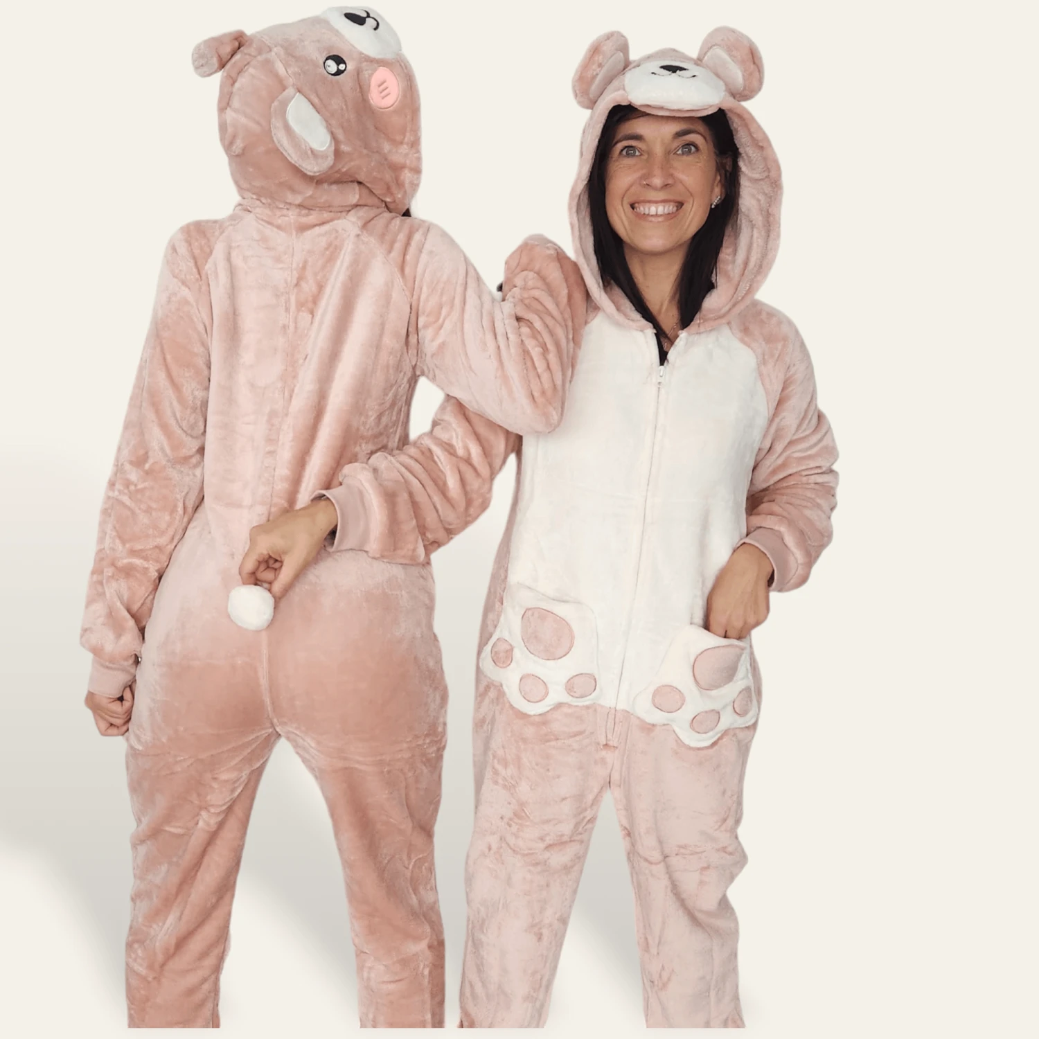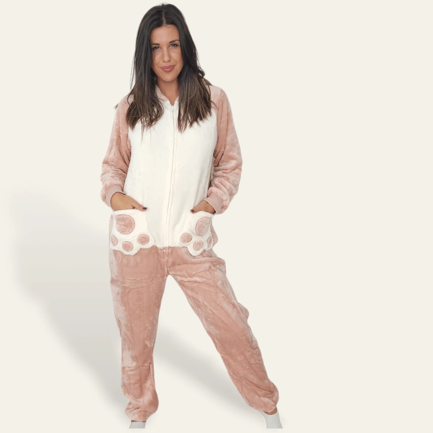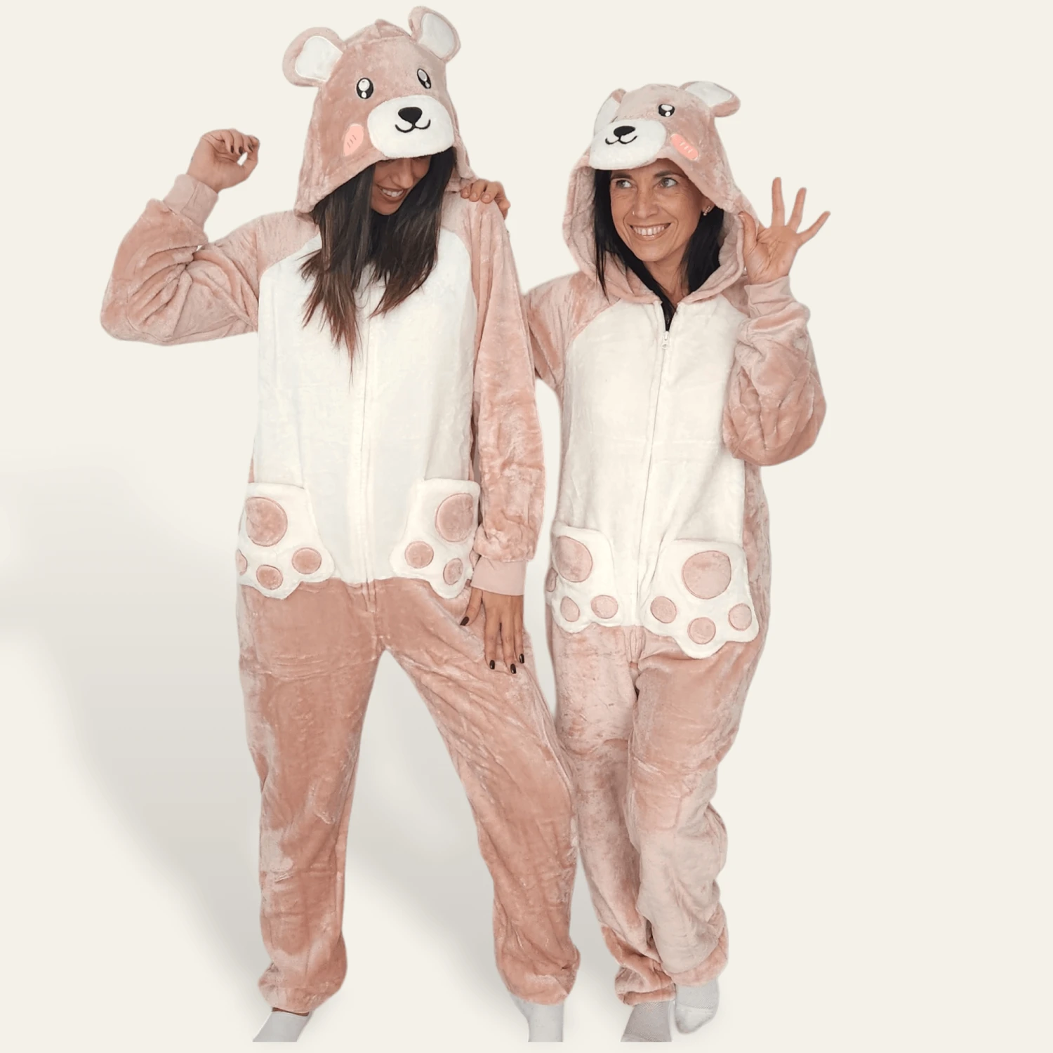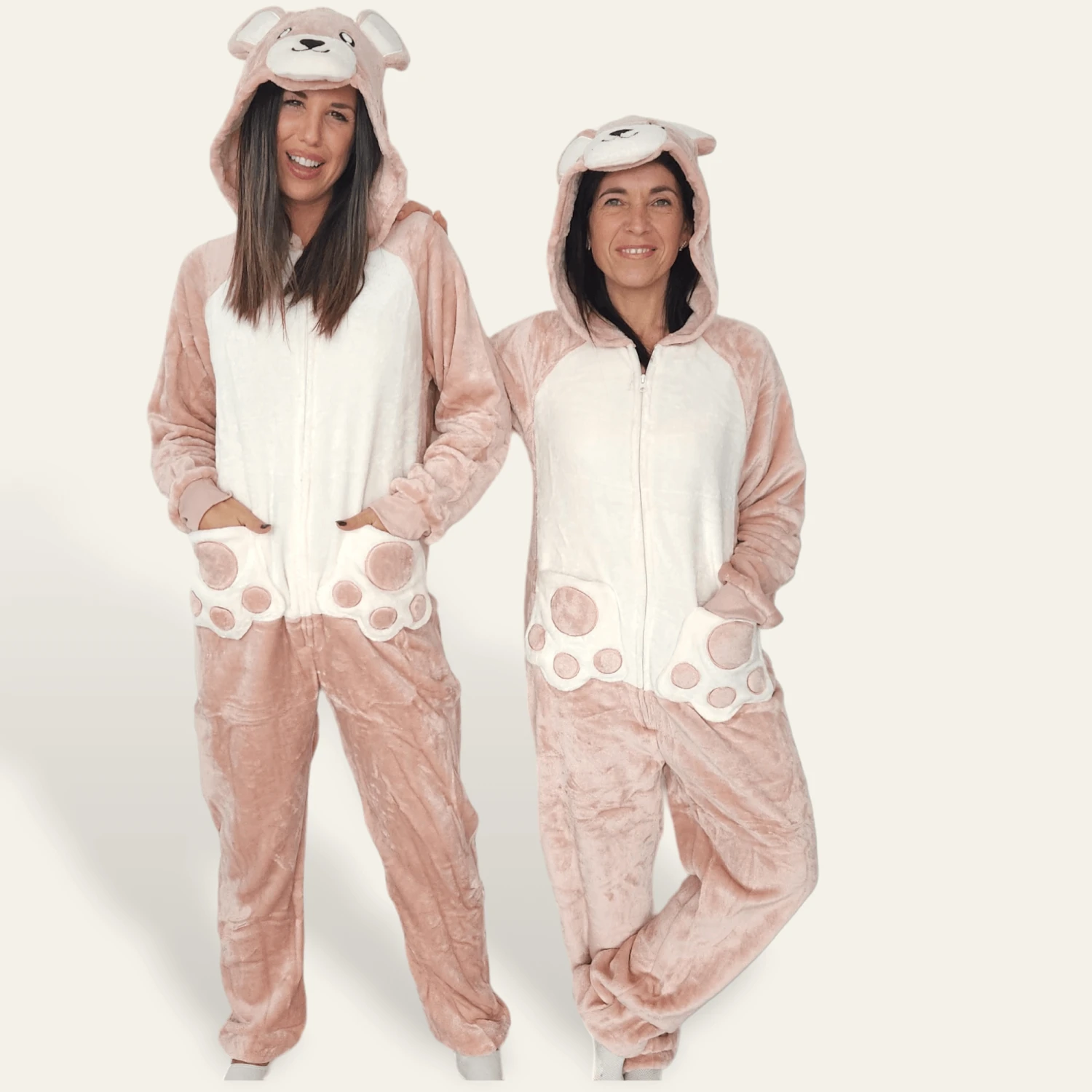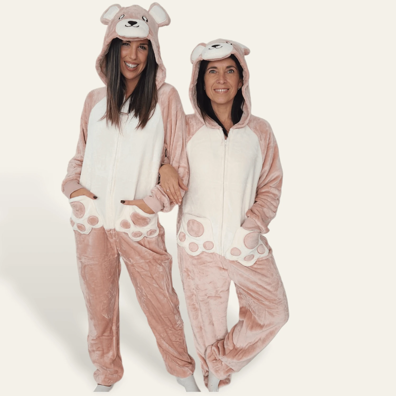 Pijama súper jugoso con capucha y bolsillos. Se abrocha con cremallera y tiene puño en manga y pies.