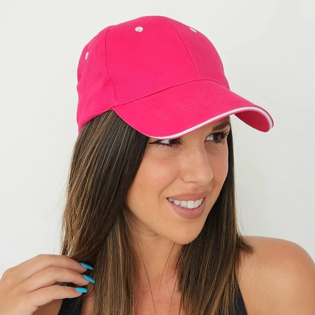 Gorra 6 paneles con sándwich a contraste. Tiene 6 orificios de ventilación bordados a contraste, 6 líneas pespunte en visera. Cinta antisudoral en el interior y cierre velcro.
