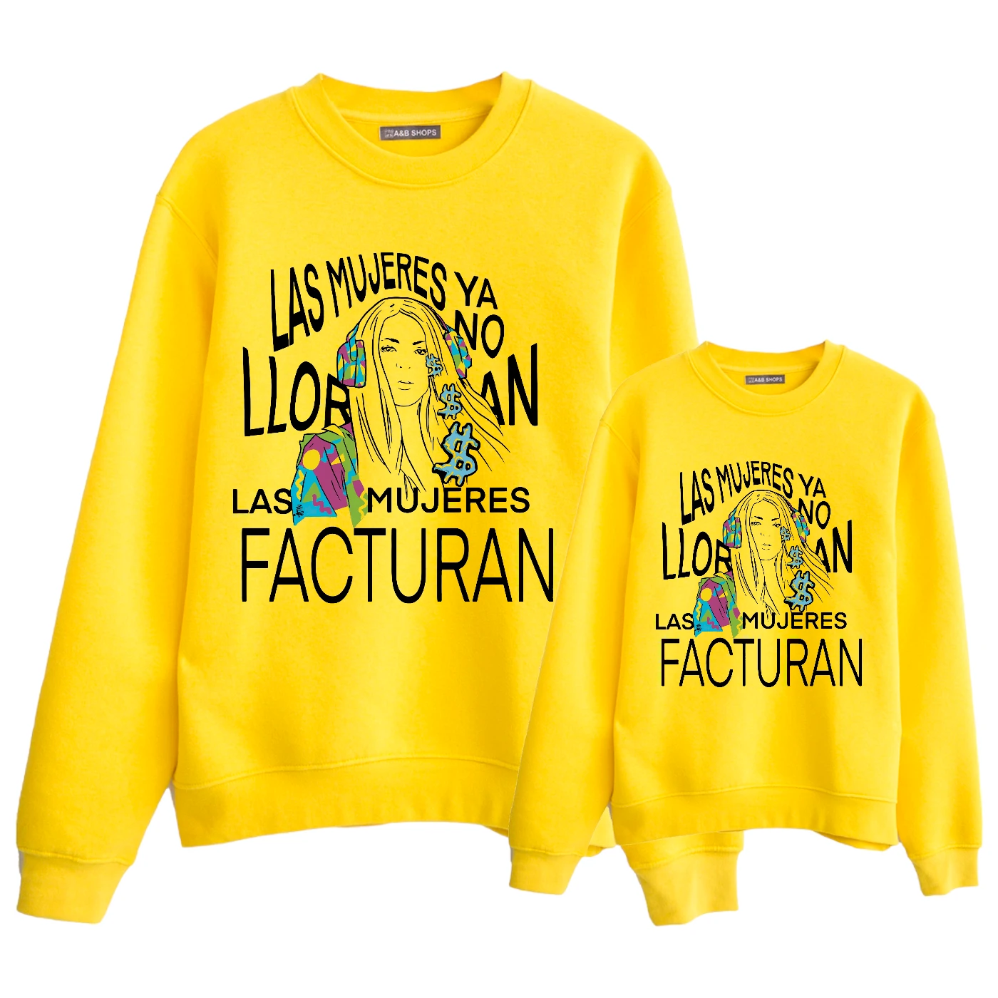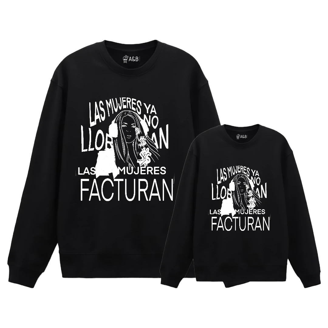Las mujeres ya no lloran, las mujeres Facturan!!!. La sudadera con una frase de gran actualidad y que todas hemos cantado a pleno pulmón.
