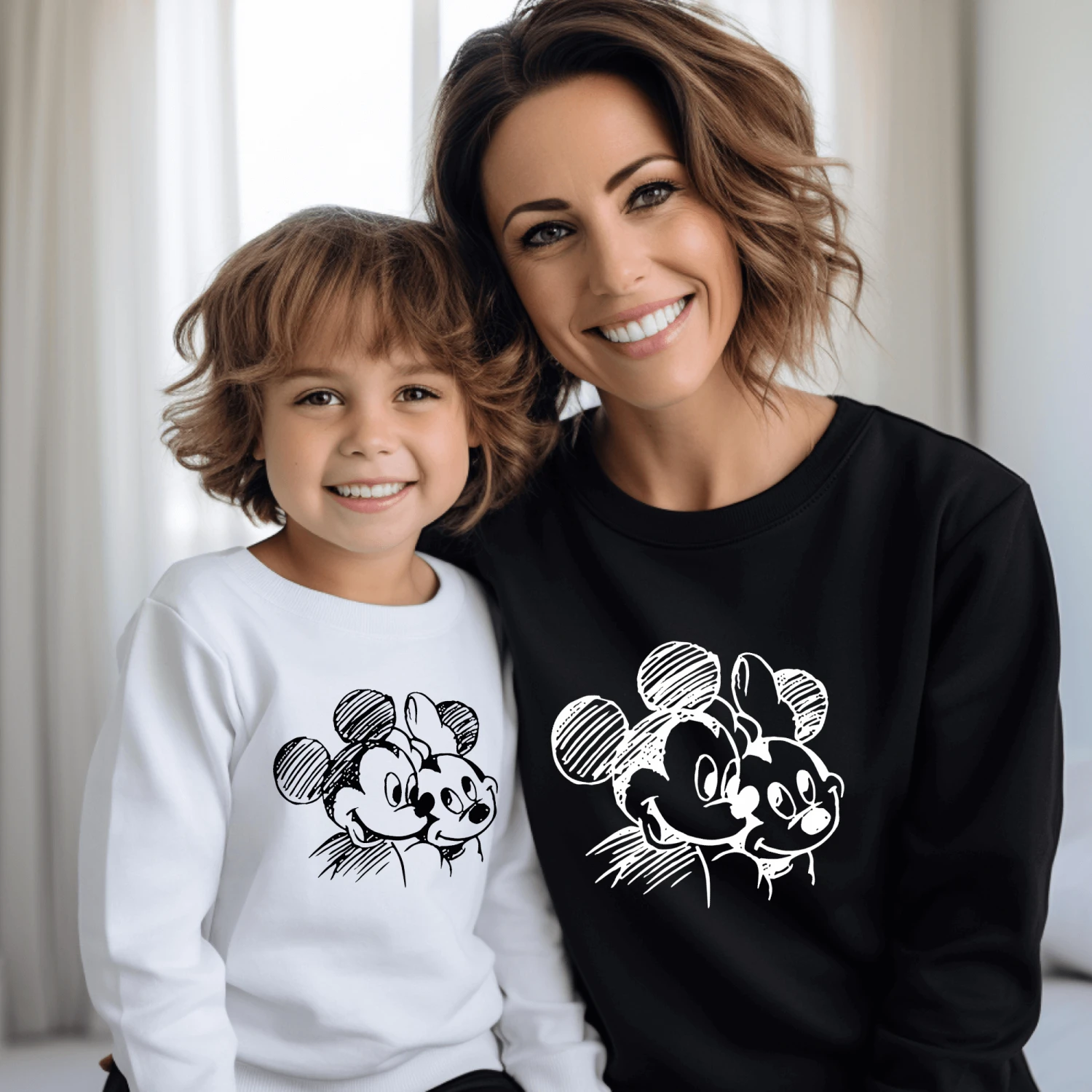 Sudadera igual para toda la familia con nuestra pareja favorita, Mickey y Minnie hecho a lápiz, en contraste con el color de la sudadera.